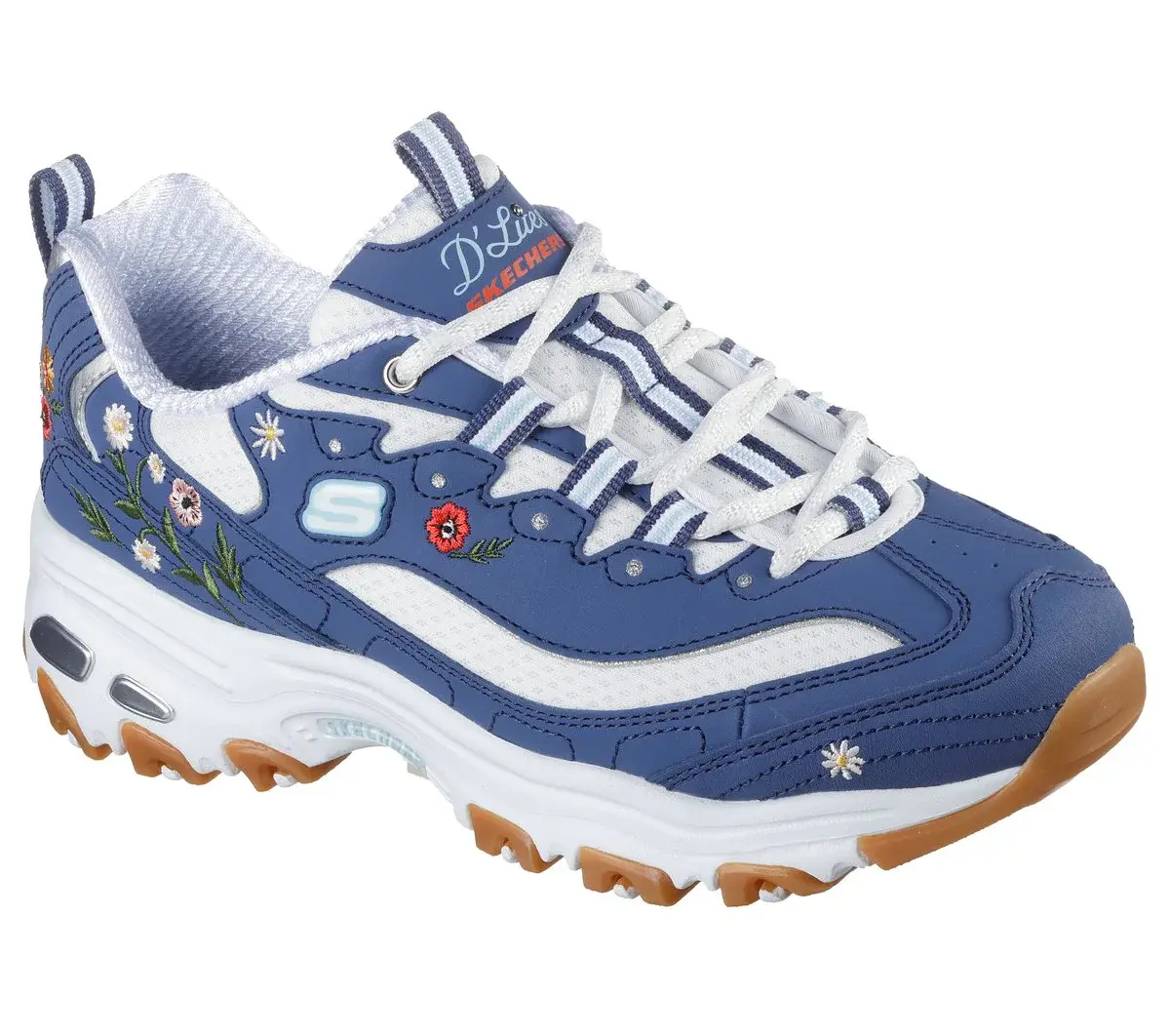 Treten Sie mit dem Skechers D’Lites® – Spring Bloom in kultigem Stil mit floralem Twist auf. Dieses lässige Schnürmodell verfügt über ein Obermaterial aus Duraleder mit gestickten Blumen, eine gepolsterte Skechers Air-Cooled Memory Foam®-Innensohle und eine stützende, stoßdämpfende Zwischensohle.