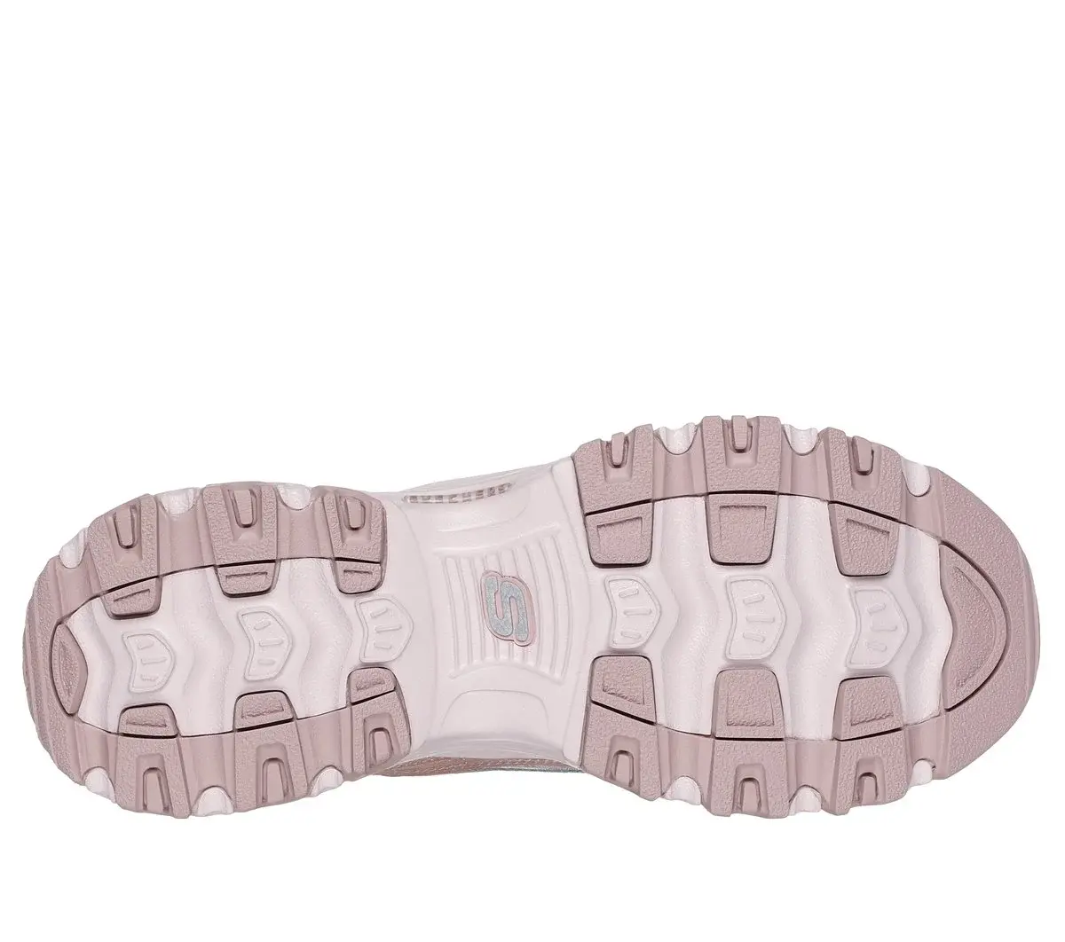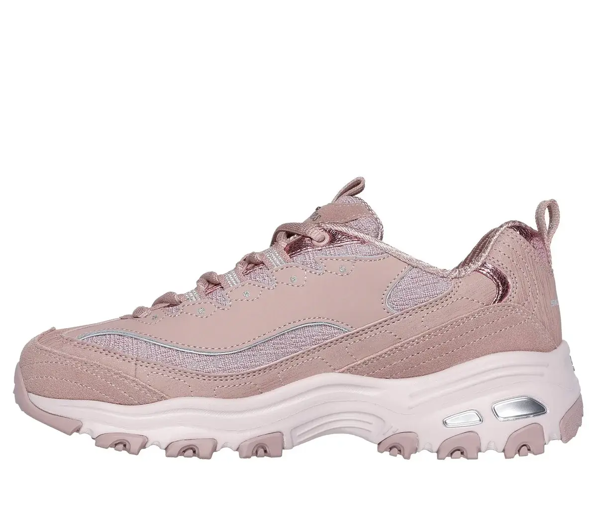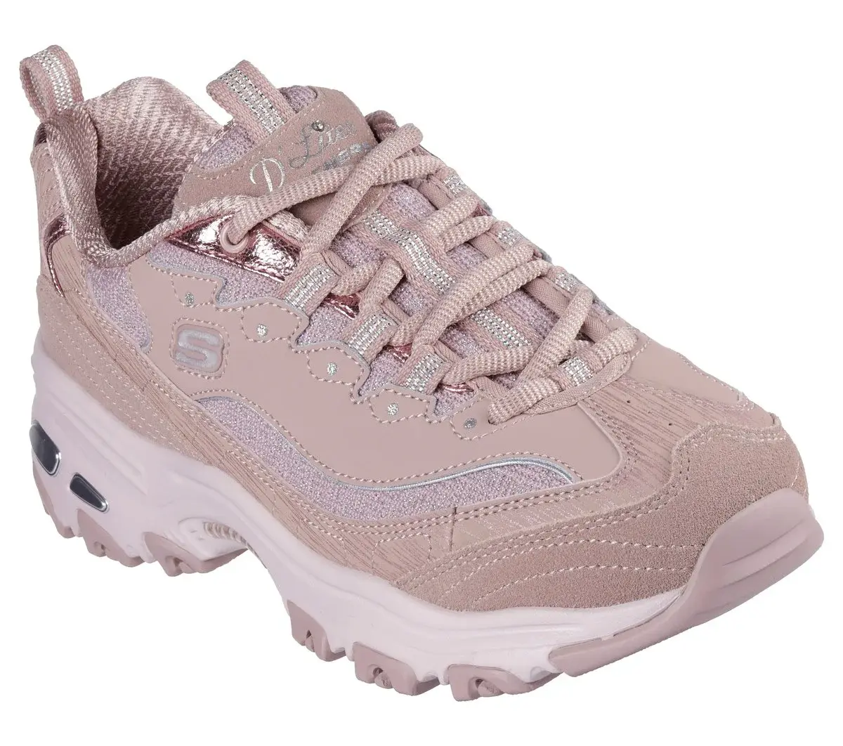 Ein klassischer Look wird mit Skechers D’Lites® – Reflections durch Komfort aufgewertet. Dieser modische Schnürschuh verfügt über ein Obermaterial aus Leder mit metallischem Besatz und eine gepolsterte Skechers Air-Cooled Memory Foam®-Innensohle.