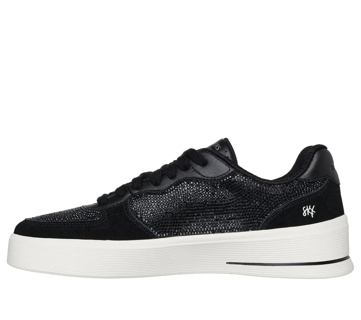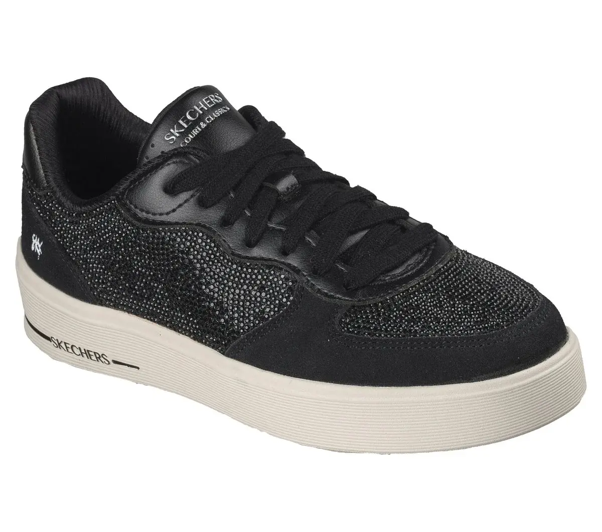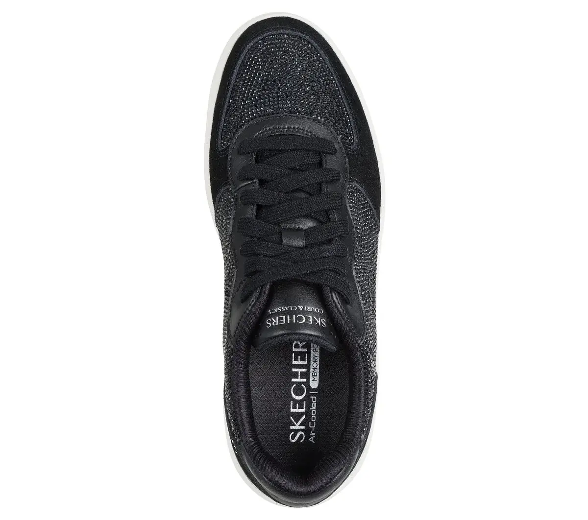 Erhöhen Sie Glanz und Komfort mit dem Skechers Hiland – Dazzling Days. Dieser Schnürschuh im Court-Stil besticht durch ein Obermaterial aus strassbesetztem Stoff und echtem Wildleder, eine gepolsterte Skechers Air-Cooled Memory Foam®-Innensohle und einen versteckten Fersenkeil.