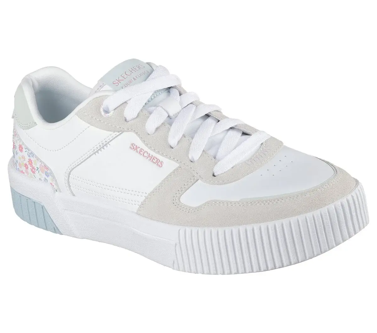 Genießen Sie blumengeschmückten Komfort auf dem Court mit dem Skechers Jade – Dainty Florals. Dieser Low-Top-Schnürschuh verfügt über ein Obermaterial aus farblich abgesetztem Duraleder und Wildleder mit einer Fersenkappe mit Blumenmuster und einer gepolsterten Skechers Air-Cooled Memory Foam®-Komfort-Innensohle.