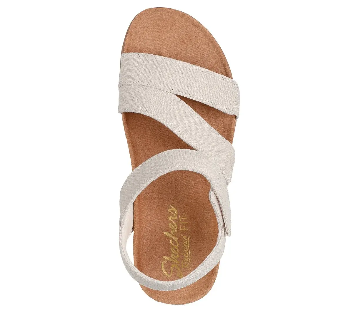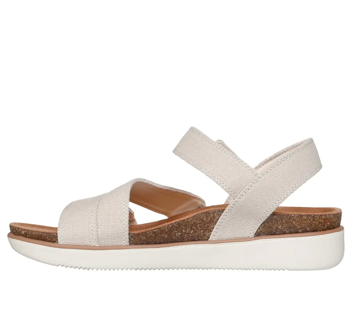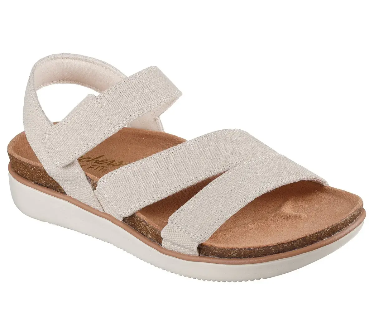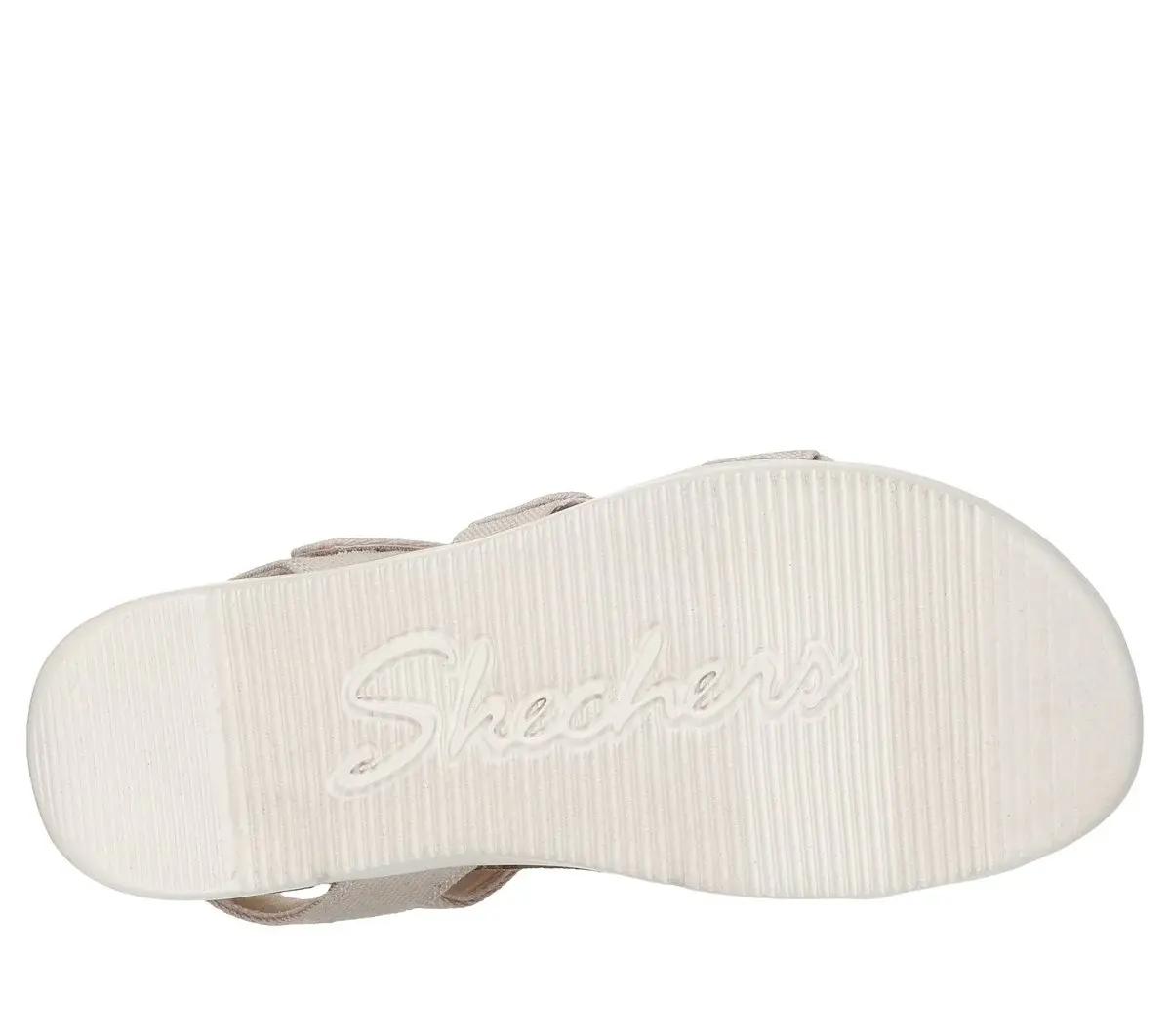Verleihen Sie Ihrem Sommerlook mit Skechers Lifted Comfort – Dreamy Eyes ein modernes Design. Diese vegane Slingback-Sandale hat ein Obermaterial aus glitzerndem Canvas mit verstellbarem Klettverschluss und ein gepolstertes Komfortfußbett mit Korkbesatz.