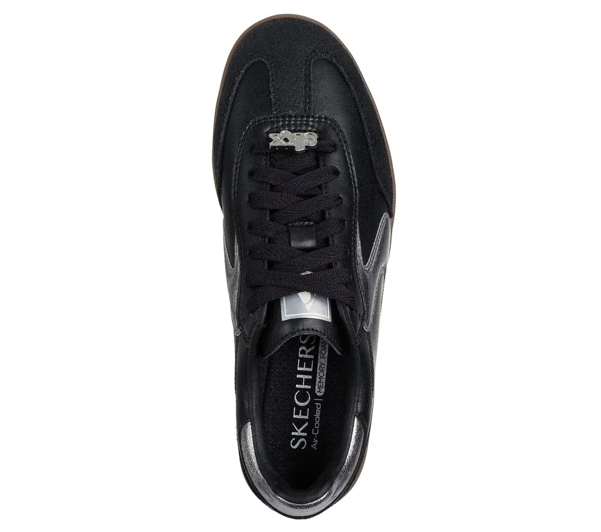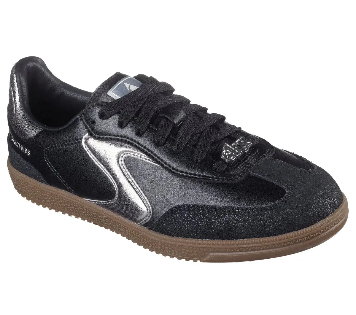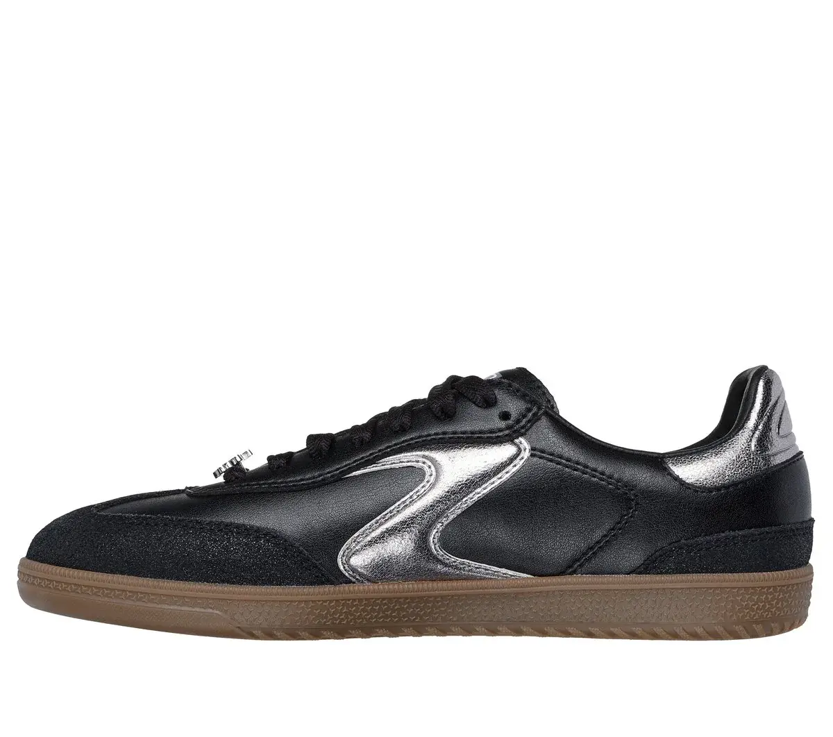 Ein moderner Klassiker trifft auf frischen Komfort im Skechers Hotshot – Cool Glow. Dieser Schnürsneaker im Court-Stil verfügt über ein Obermaterial aus Duraleder mit Kunstwildleder-Overlays, metallischen Farbakzenten und einer gepolsterten Skechers Air-Cooled Memory Foam®-Innensohle.