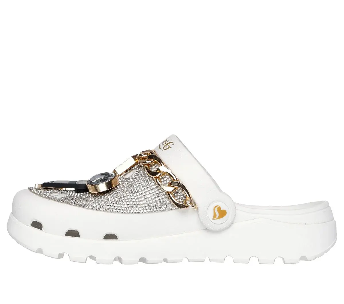 Haute Drop: Repräsentieren Sie das D-O-Doppel-G in glamourösem Komfort mit Skechers x Snoop Dogg: Arch Fit® Footsteps – Rolling N Gold. Dieser auffällige Fashion-Clog verfügt über ein mit Strasssteinen besetztes EVA-Obermaterial mit Goldkettendetail, abnehmbare Anhänger im Snoop-Stil und ein konturiertes Arch Fit®-Fußbett.