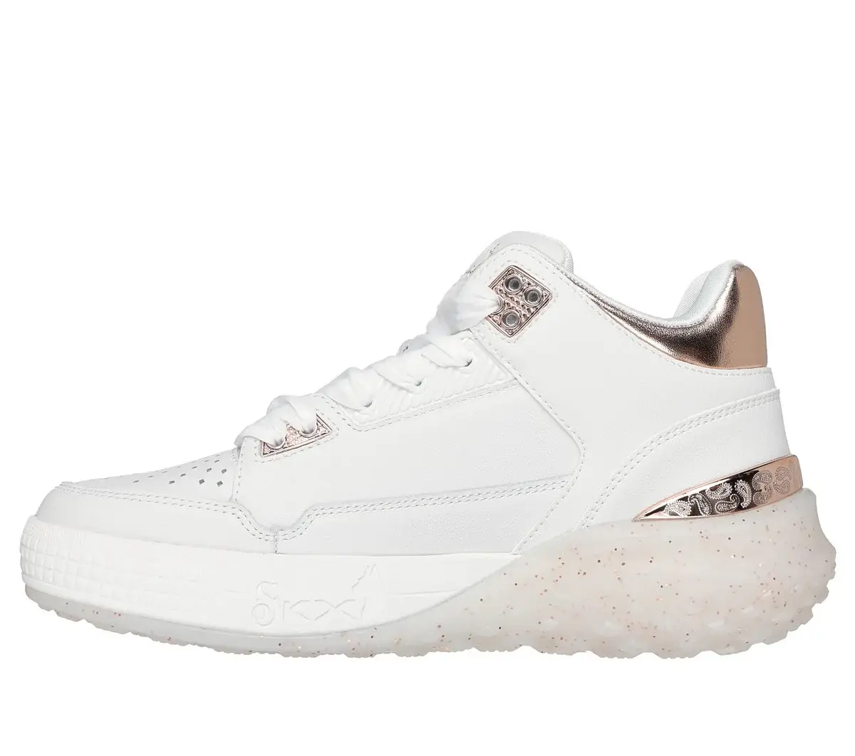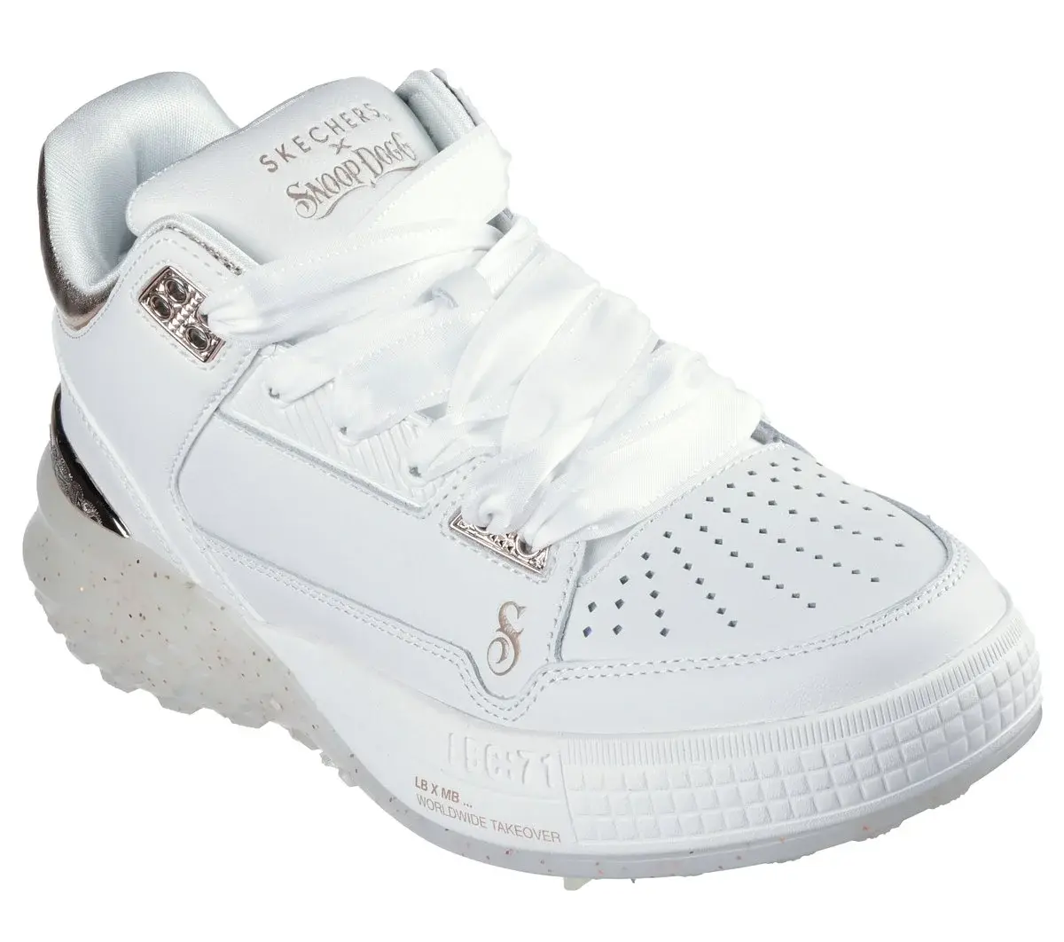 Fallend heiß: Skechers x Snoop Dogg: Sizzle – Buckets. Dieser coole Mid-Top-Court-Style ist so einzigartig wie der D-O-Double G selbst. Mit glattem, perforiertem Obermaterial aus hochwertigem Leder mit metallischem Kragen und Fersenbesatz, einer Laufsohle mit Glitzersprenkeln und einer superweichen Skechers Air-Cooled Memory Foam®-Einlegesohle.