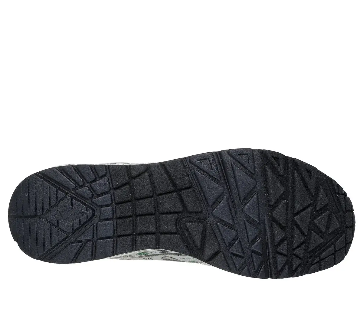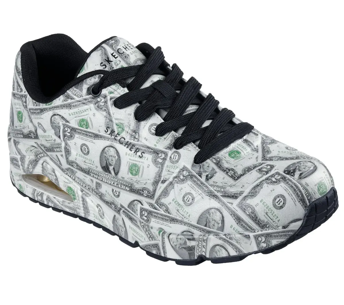 Fühlen Sie sich mit jedem Schritt wie eine Million Dollar im Skechers Street™ Uno – Raining Money. Dieser modische Schnürsneaker hat ein Obermaterial aus Duraleder mit einem Allover-2-Dollar-Schein-Print, eine durchsichtige Skech-Air®-Airbag-Zwischensohle und eine Skechers Air-Cooled Memory Foam®-Einlegesohle für perfekten Tragekomfort.