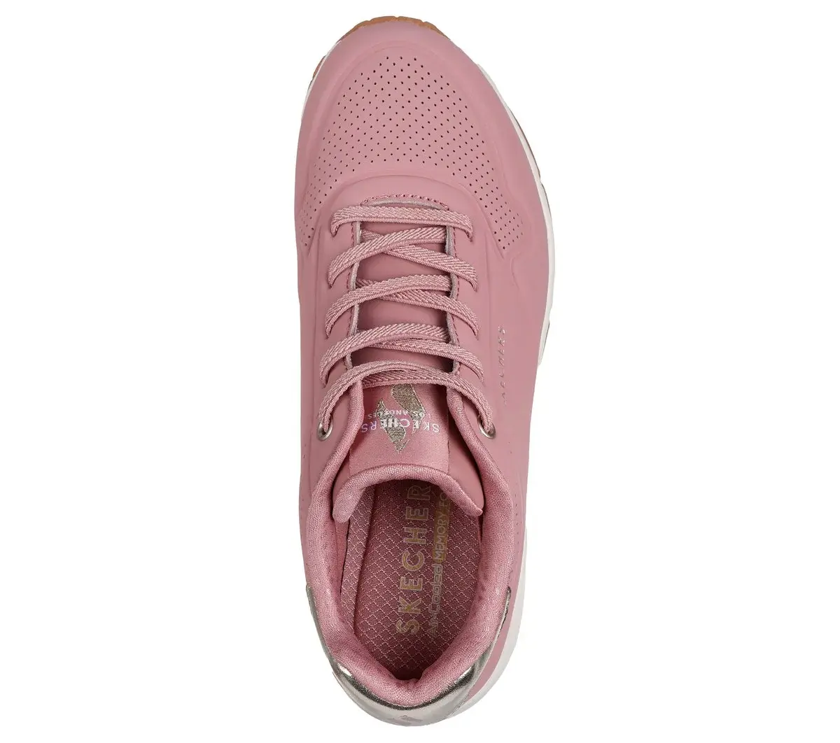Genießen Sie diese Saison einen klassischen Stil mit Skechers Street™ Uno – Shimmer Away. Dieser modische Sneaker mit Keilabsatz verfügt über ein Obermaterial aus synthetischem Durabuck mit metallischem Fersenbesatz, elastische Schnürsenkel, eine Skechers Air-Cooled Memory Foam®-Einlegesohle und eine sichtbare Skech-Air®-Airbag-Zwischensohle.