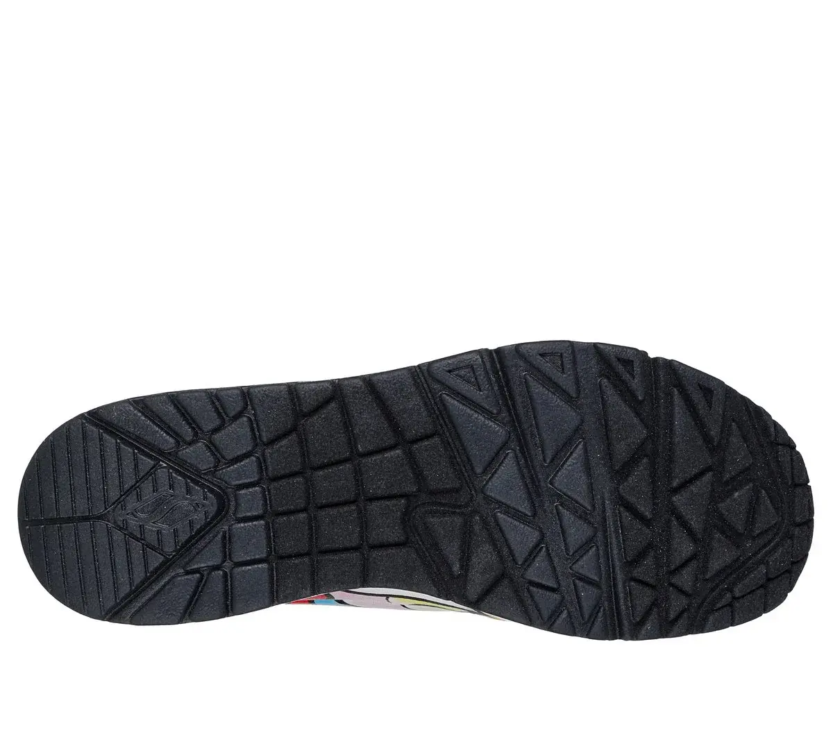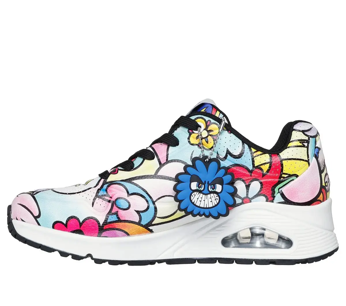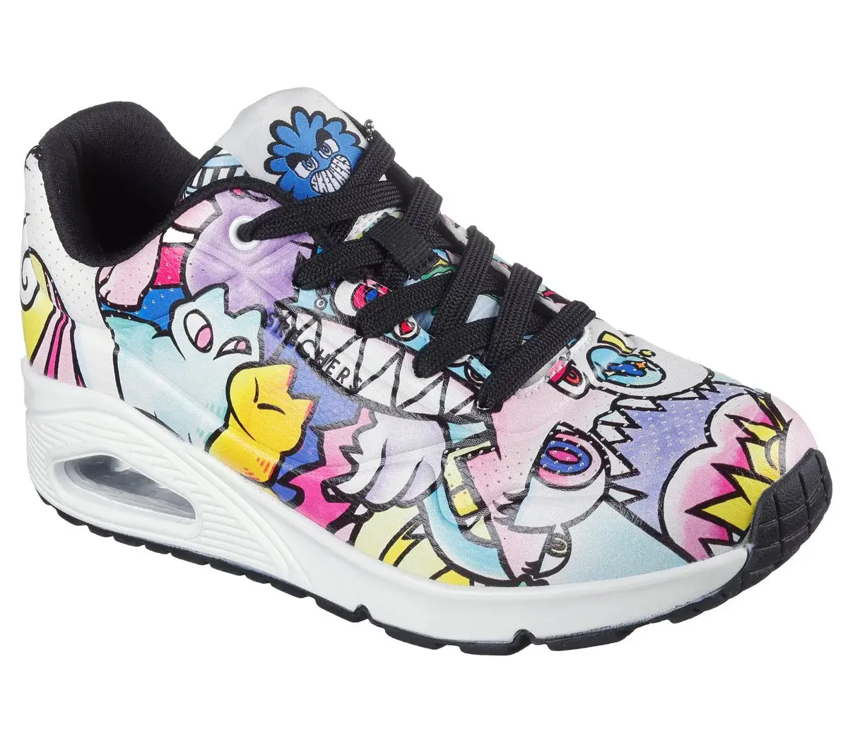 Tauchen Sie mit unserer neuesten Zusammenarbeit in die fantasievolle Welt von Skechers Street™ x Vexx ein! Vexx hat Skechers zu seiner persönlichen Leinwand gemacht und seine charakteristischen „Kritzeleien“ nahtlos mit unseren legendären Schuhen und Kleidungsstücken verschmolzen, um eine Kollektion voller lebendiger Farben und verspielter Bilder zu kreieren. Der vom Designprozess des Künstlers inspirierte Uno – Color Doodle Fashion-Sneaker verfügt über ein Obermaterial aus synthetischem Durabuck mit den charakteristischen „Kritzeleien“ von Vexx, einer Skechers Air-Cooled Memory Foam®-Einlegesohle und einer sichtbaren luftgepolsterten Skech-Air®-Zwischensohle.