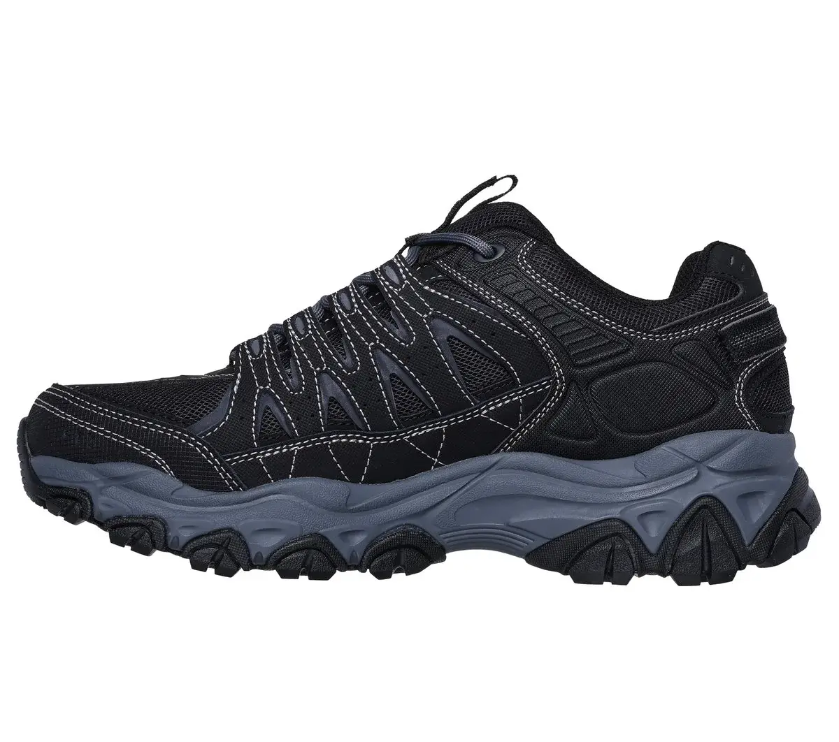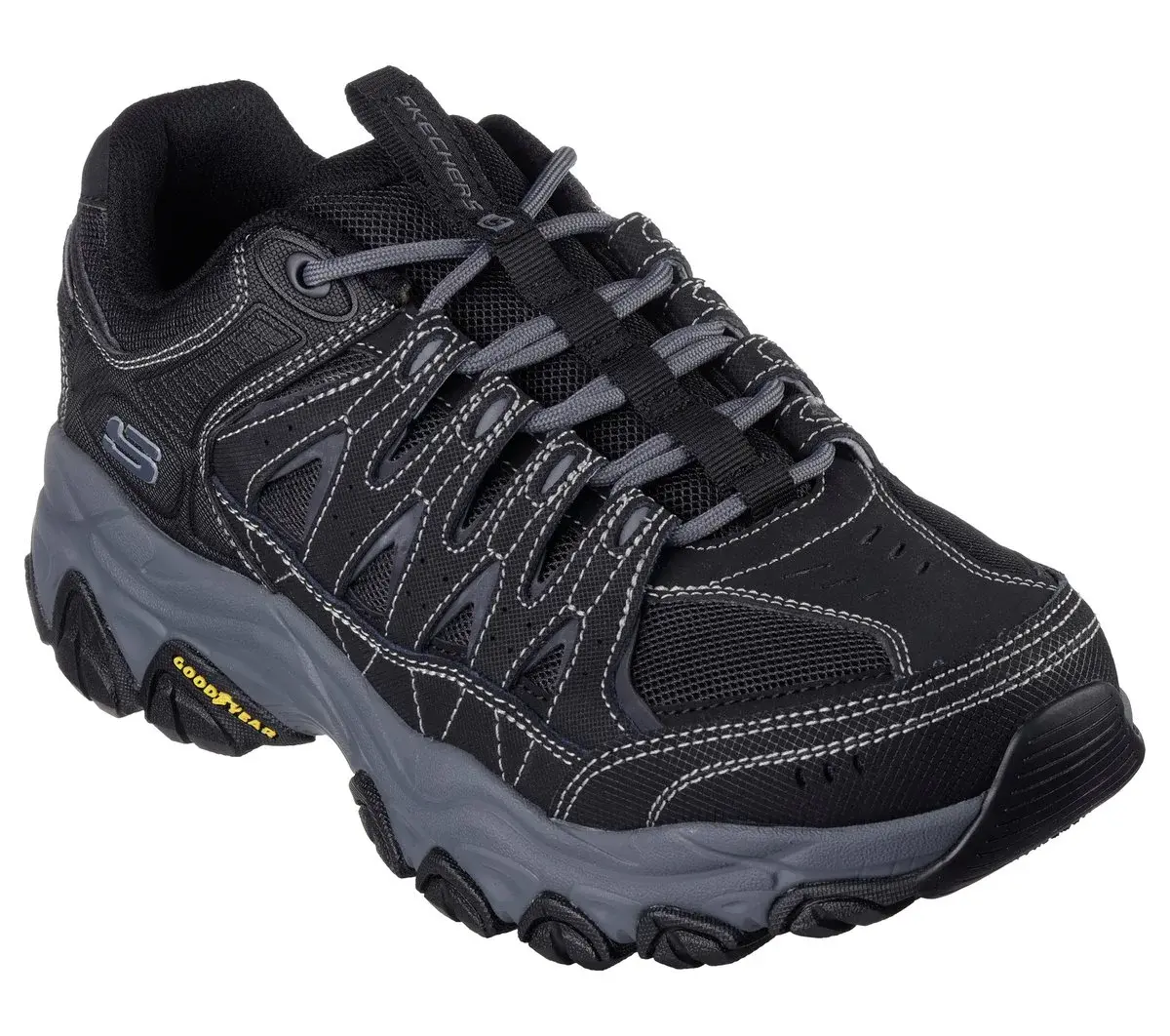Erkunden Sie wildes Gelände bequem mit dem Skechers After Burn M.Fit 2.0. Dieses Outdoor-Trail-Schnürmodell verfügt über ein Obermaterial aus Leder, Synthetik und Mesh mit einer gepolsterten Skechers Memory Foam™-Innensohle und einer Goodyear®-Gummilaufsohle.