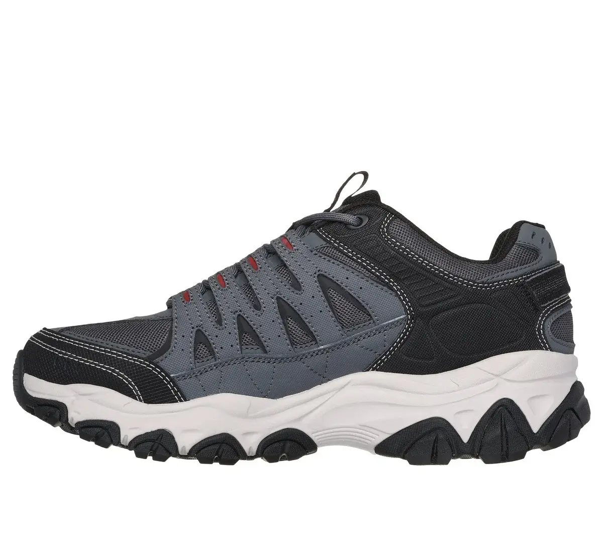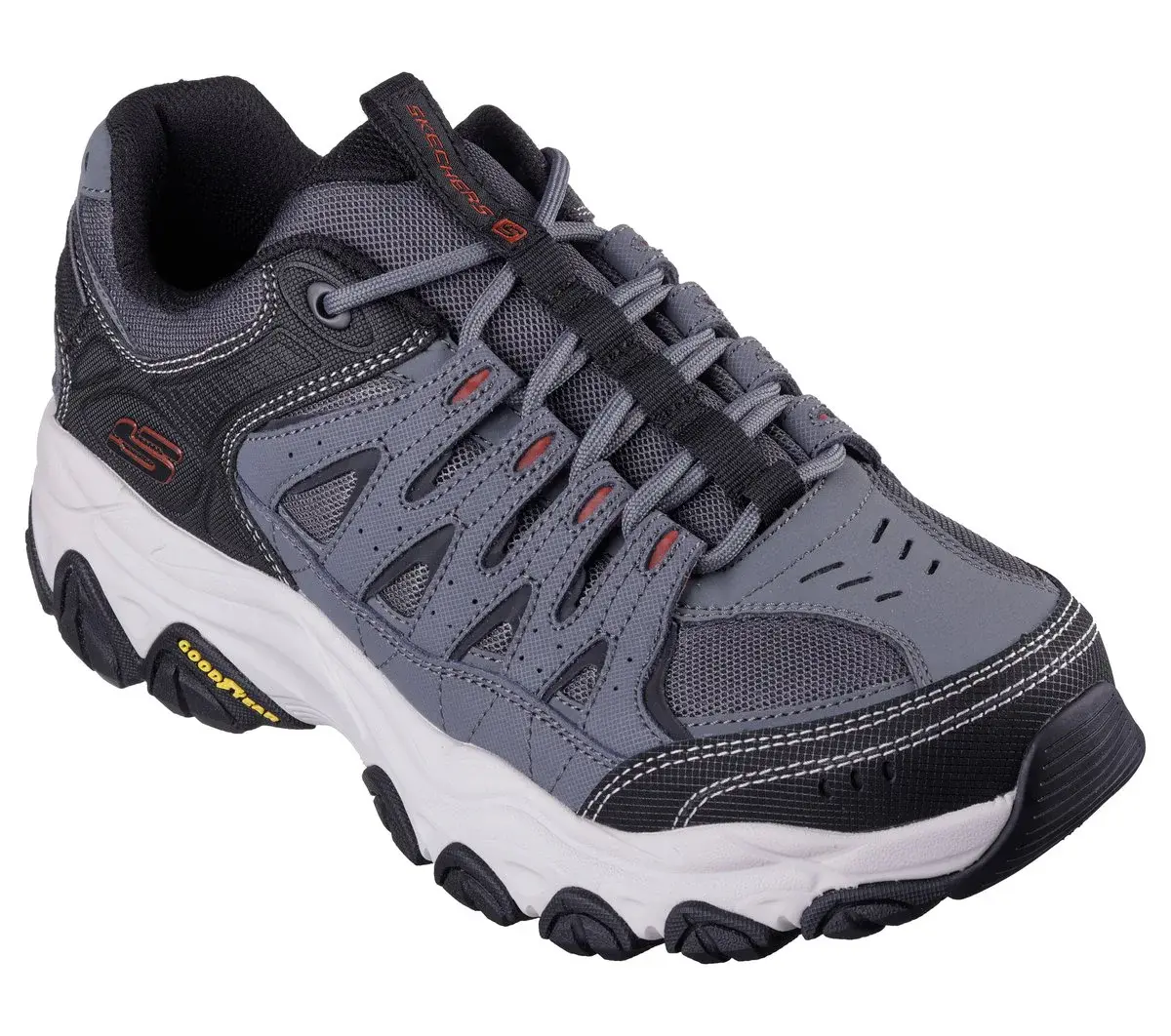 Erkunden Sie wildes Gelände bequem mit dem Skechers After Burn M.Fit 2.0. Dieses Outdoor-Trail-Schnürmodell verfügt über ein Obermaterial aus Leder, Synthetik und Mesh mit einer gepolsterten Skechers Memory Foam™-Innensohle und einer Goodyear®-Gummilaufsohle.
