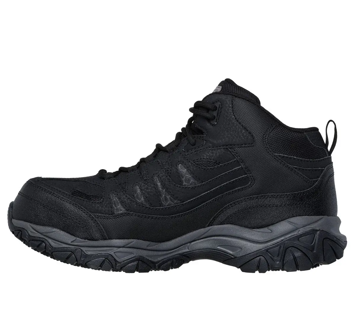 Genießen Sie Komfort und Sicherheit mit Skechers Work™: Holdredge – Thorem Carbon Toe. Dieser rutschfeste Stiefel verfügt über ein Obermaterial aus Leder und Synthetik mit Schnürung, eine gepolsterte Skechers Air-Cooled Memory Foam®-Komfortsohle und eine Carbon-Nano-Sicherheitskappe mit integriertem Mittelfußschutz.