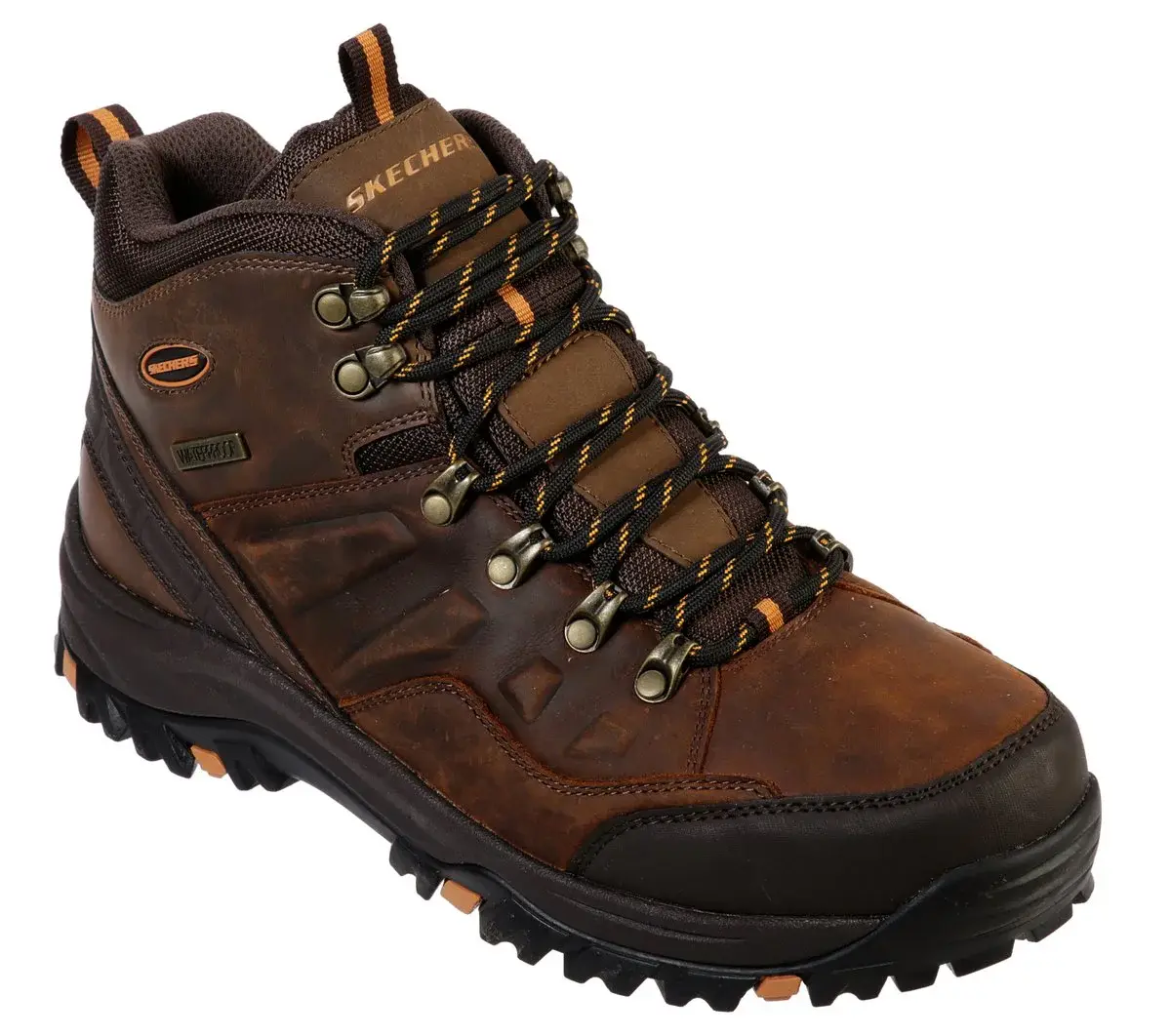 Gehen Sie mit Skechers Relaxed Fit®: Relment – Traven in robustem, geländetauglichem Stil und Komfort voran. Diese Schnürstiefelette im Wanderstil verfügt über ein wasserdichtes, strapazierfähiges Obermaterial aus glattem Leder, Synthetik und Mesh sowie eine gepolsterte Memory Foam-Innensohle.