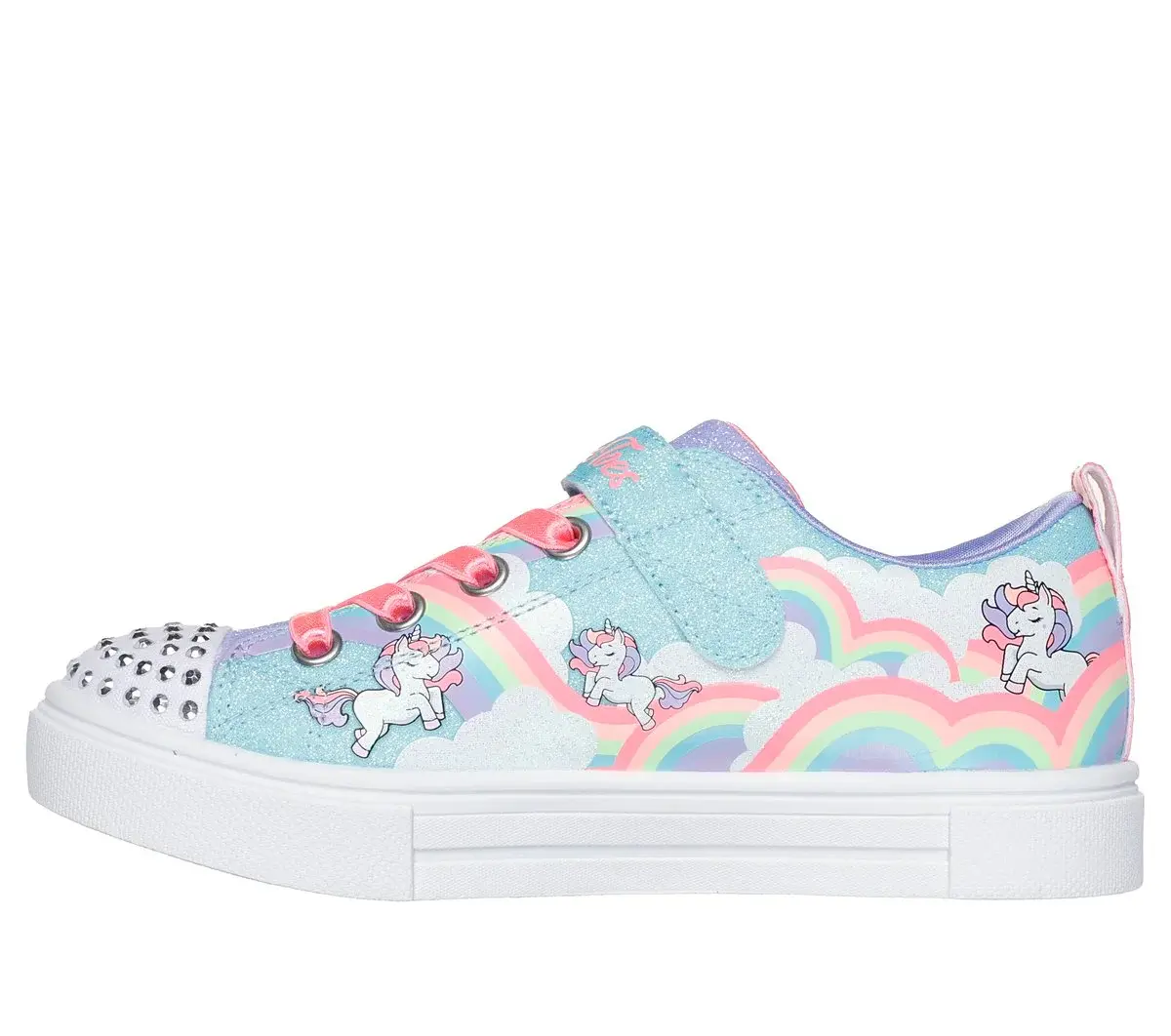 Erobern Sie die Lüfte im magischen Einhorn-Stil mit Skechers Twinkle Toes®: Twinkle Sparks – Jumpin‘ Clouds. Dieses glitzernde, leuchtende Design verfügt über ein Obermaterial aus Canvas mit Regenbogen-Einhorn-Print, elastische Schnürsenkel, einen verstellbaren Spannriemen und eine mit leuchtenden Strasssteinen verzierte Zehenkappe.