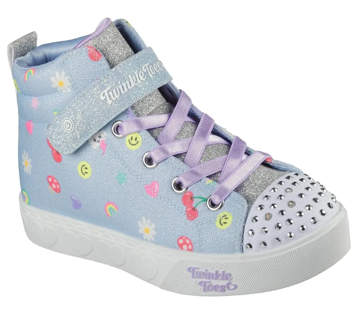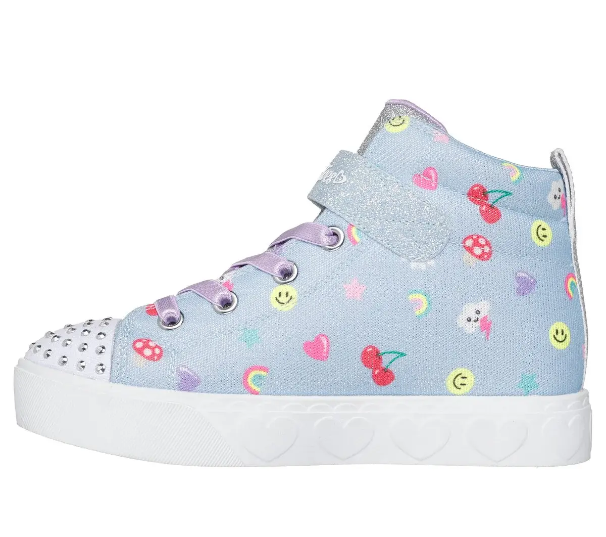 Bringen Sie mit dem glitzernden Stil von Skechers Twinkle Toes®: Heart Steps – Icon Party jeden Raum zum Leuchten. Dieser modische High-Top-Sneaker verfügt über ein Obermaterial mit Glitzer und einem lustigen Mikro-Print, elastische Schnürsenkel, einen verstellbaren Ristriemen und eine mit leuchtenden Strasssteinen verzierte Zehenkappe.