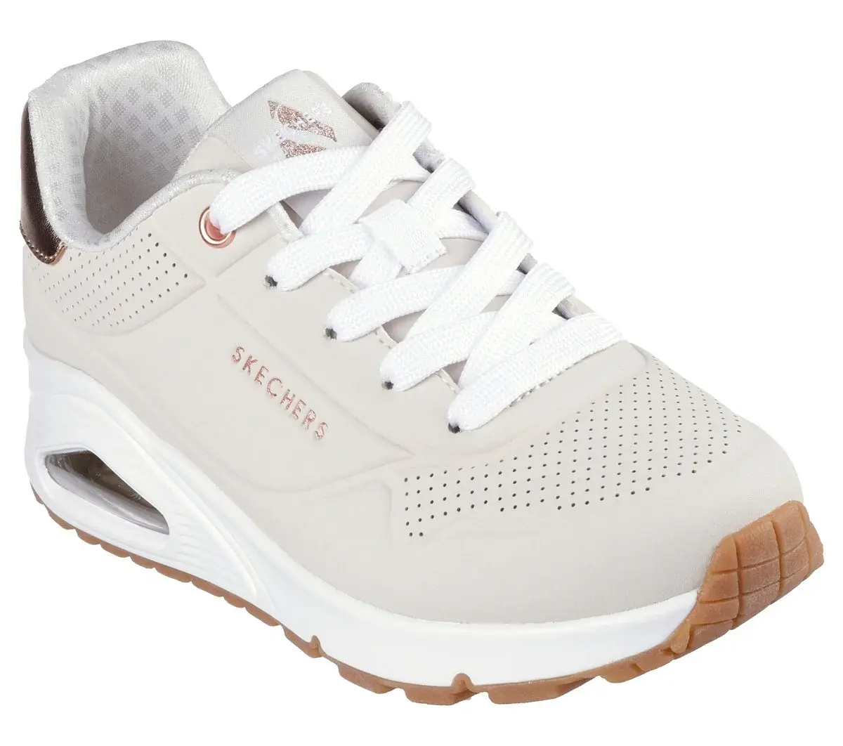 Erhöhen Sie Ihr Sneaker-Erlebnis mit gepolstertem Komfort im Skechers Street™ Uno Gen1 – Shimmer Away. Dieser modische Schnürsneaker verfügt über ein Obermaterial aus synthetischem Duraleder mit Metallic-Besatz, eine Skechers Air-Cooled Memory Foam®-Komfort-Innensohle und eine sichtbare Skech-Air®-Airbag-Zwischensohle.